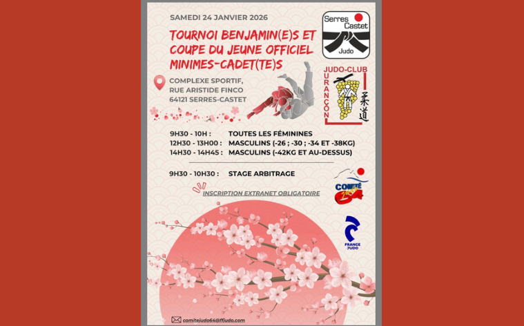 Les judokas benjamins (2014-2015) et ceintures orange de Lescar Judo sont invités à participer au tournoi des benjamins, organisé par Serres-Castet Judo.