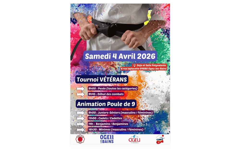 Les benjamin(e)s (2014 et 2015) et minimes (2012 et 2013) de Lescar Judo sont invités à participer à un tournoi en Poules de 9 le samedi 04 avril à Ogeu-les-bains.
